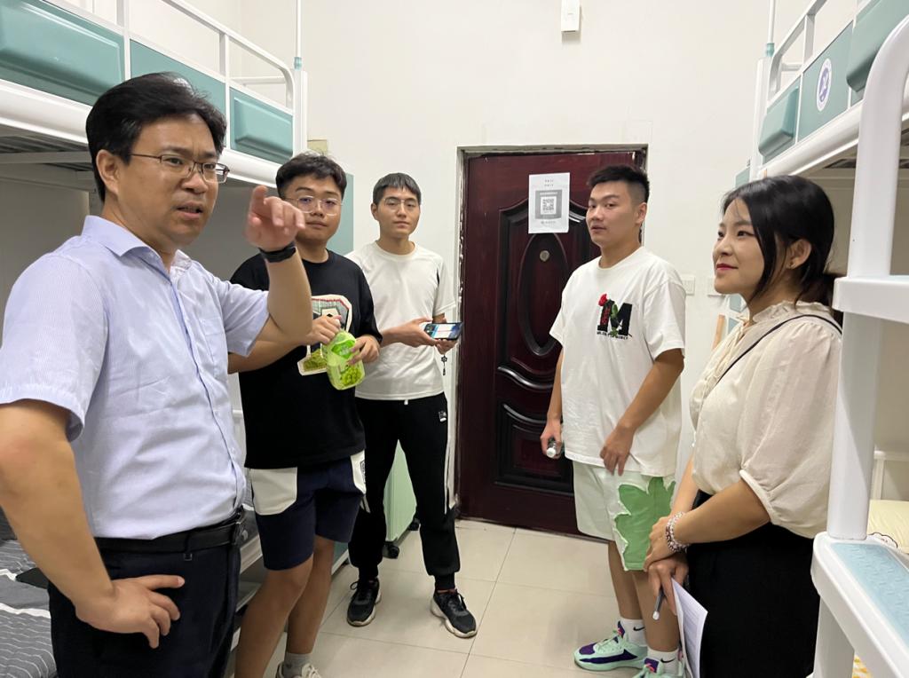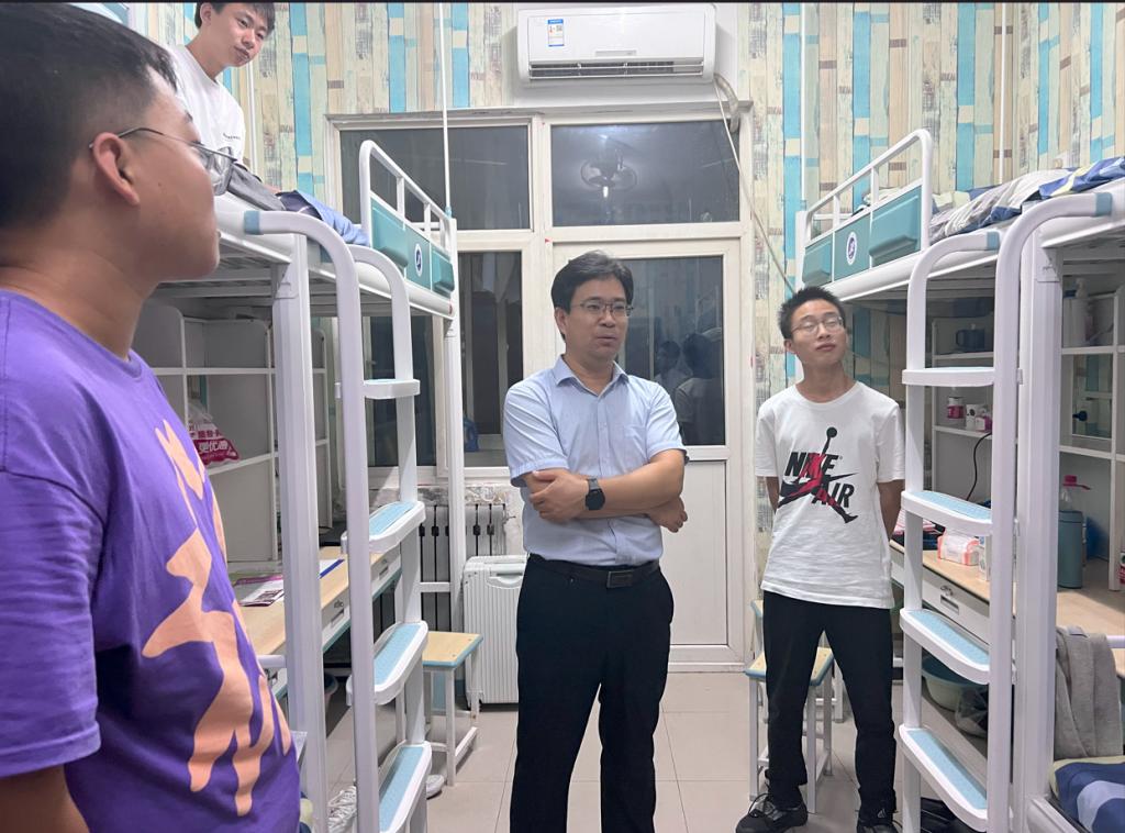 96日,在新生入校报到当晚,学院党委书记宋海洋、学生工作办公室主任马武军、2023级辅导员卢筱佳深入新生宿舍,详细了解新生的住宿和生活情况。在走访过程中,宋海洋与新生进行亲切交谈,从住宿饮食、生活习惯、发展规划等多方面深入了解学生情况,询问同学们的报到流程是否顺利,关心同学们的入住体验,并进行现场沟通解决,帮助同学们尽快适应新生活。宋海洋叮嘱新生与同学之间要相互关心,相互帮助,尽快调整好状态、适应大学新环境,以良好的状态迎接大学生活。