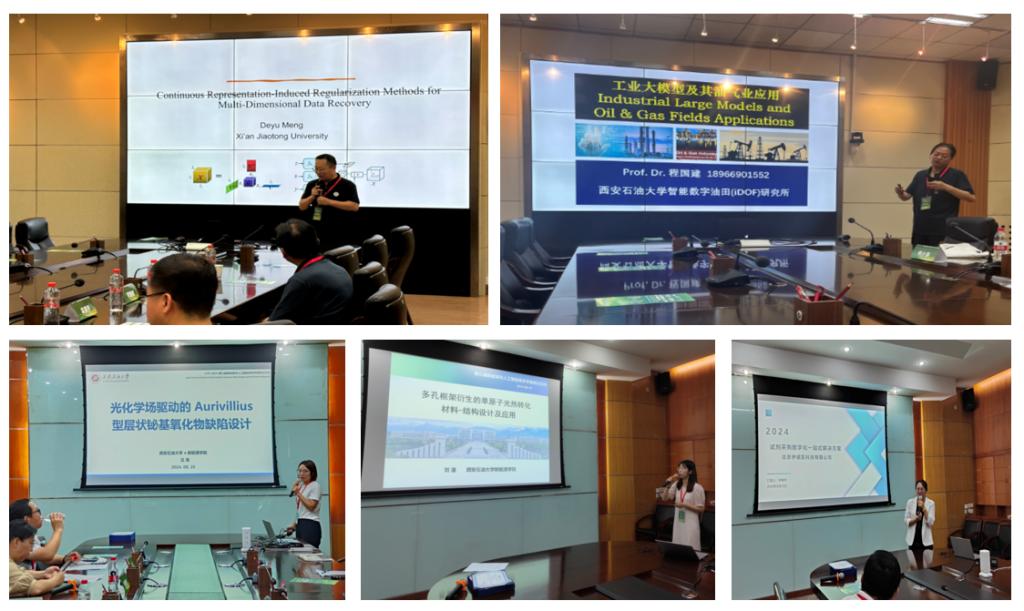 在“新能源+ ”“人工智能+ ”两个分论坛中,来自西安交通大学、西安理工大学及我校的32名师生做了专题报告,报告由折延宏、高国旺、肖美霞、安敏荣、王磊、吕英、毕佳颖、刘潼八位教师主持。国家级高层次人才、西安交通大学孟德宇教授做了题为“Continuous Representation-Induced Regularization Methods for Multi- Dimensional Data Recovery”的报告;我校程国建教授做了题为“工业大模型及其油气业应用”的报告;我校吕英副教授做了题为“光化学场驱动的Aurivillius型层状铋基氧化物缺陷设计”的报告;我校青年教师刘潼做了题为“多孔框架衍生的单原子光热转化材料-结构设计及应用”的报告。另外,西安建筑科技大学、厦门理工学院、北京伊诺凯科技有限公司等单位及我校研究生做了28个专题报告。