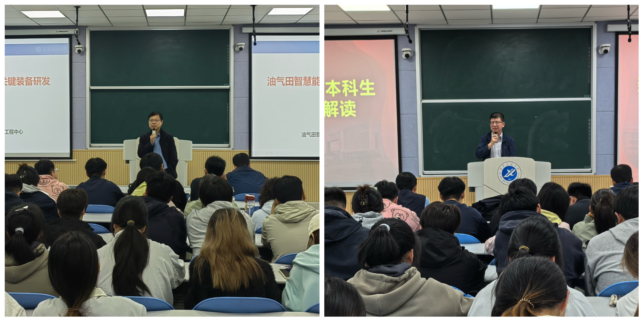 活动分为专题讲座与面对面答疑交流两个环节。在第一阶段的专题讲座中,副院长王治国教授结合自身科研教学实践,为同学们作了题为“油气田智慧能源系统构建与关键装备研发”的专题报告。他依托详实的科研案例与前沿学术理论,系统阐述了油气田智慧能源系统的发展趋势与核心技术,详细介绍了构建以新能源为主导,集多源协同、智慧运维、智慧储能、智能材料、智能设备及智慧学习于一体的智慧能源系统的重要意义与实现路径,拓宽了同学们的学术视野,激发了大家对专业领域深入探索的兴趣与热情。讲座中还融入了关于新能源与传统能源融合发展的见解,并为同学们未来求学考研规划提供了实用建议。