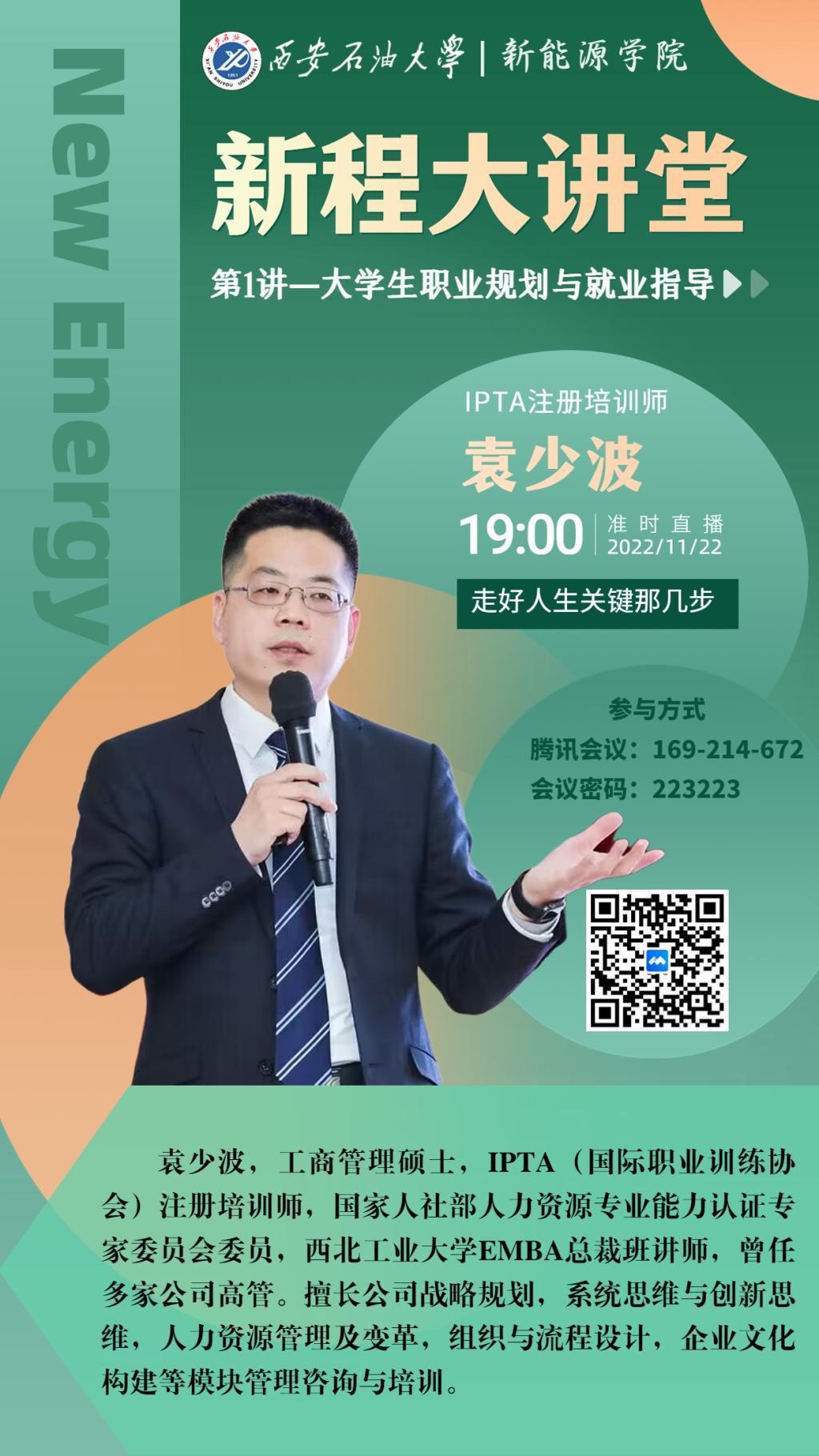 为进一步加强学院学风建设工作,打造全方位育人体系,优化学院人才培养机制,创造良好的育人生态,搭建学生与校内外优秀青年、榜样人物、行业专家交流学习的平台,自2022年11月起,taptap188平台将定期举办“新程大讲堂”。11月23日,为了更好地做好学生教育管理服务工作,在我校鄠邑校区制动管理的当天晚上,taptap188平台首期“新程大讲堂”开讲,本次讲堂特邀IPTA(国际职业训练协会)注册培训师袁少波老师作了题为“大学生职业规划与就业指导”的报告,学院2020级辅导员靳晨璐及各年级学生代表总计300余人在线参加,本次报告由学生工作办公室主任马武军主持。
