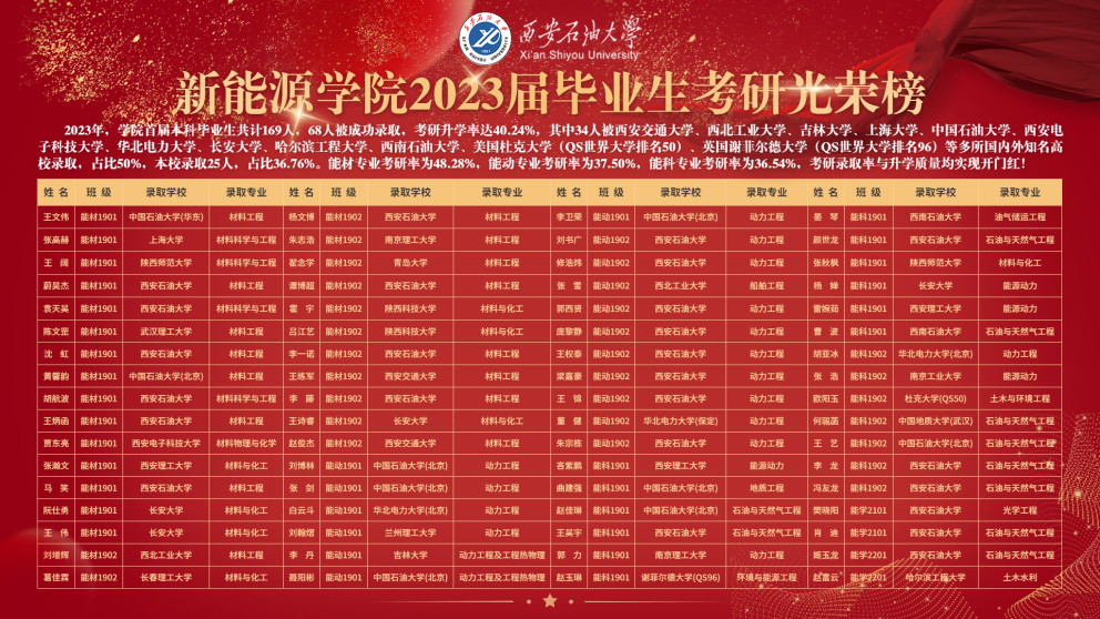 截止23年5月,taptap188平台2019级毕业生毕业去向落实率为81%,其中考研录取率为40.24%(新能源材料与器件专业考研录取率为48.28%,能源与动力工程专业考研录取率为37.50%,新能源科学与工程专业考研录取率为36.54%,)。已就业的67人中多人被隆基绿能科技股份有限公司、三星中国半导体、国家管网集团西部管道有限责任公司、胜利油田、长庆油田等知名企业签约;学院首届本科毕业生共计169人,68人被成功录取,考研升学率达40.24%,其中34人被西安交通大学、西北工业大学、吉林大学、上海大学、中国石油大学、西安电子科技大学、华北电力大学、长安大学、哈尔滨工程大学、西南石油大学、美国杜克大学(QS世界大学排名50)、英国谢菲尔德大学(QS世界大学排名96)等多所国内外知名高校录取,占比50%,本校录取25人,占比36.76%。
